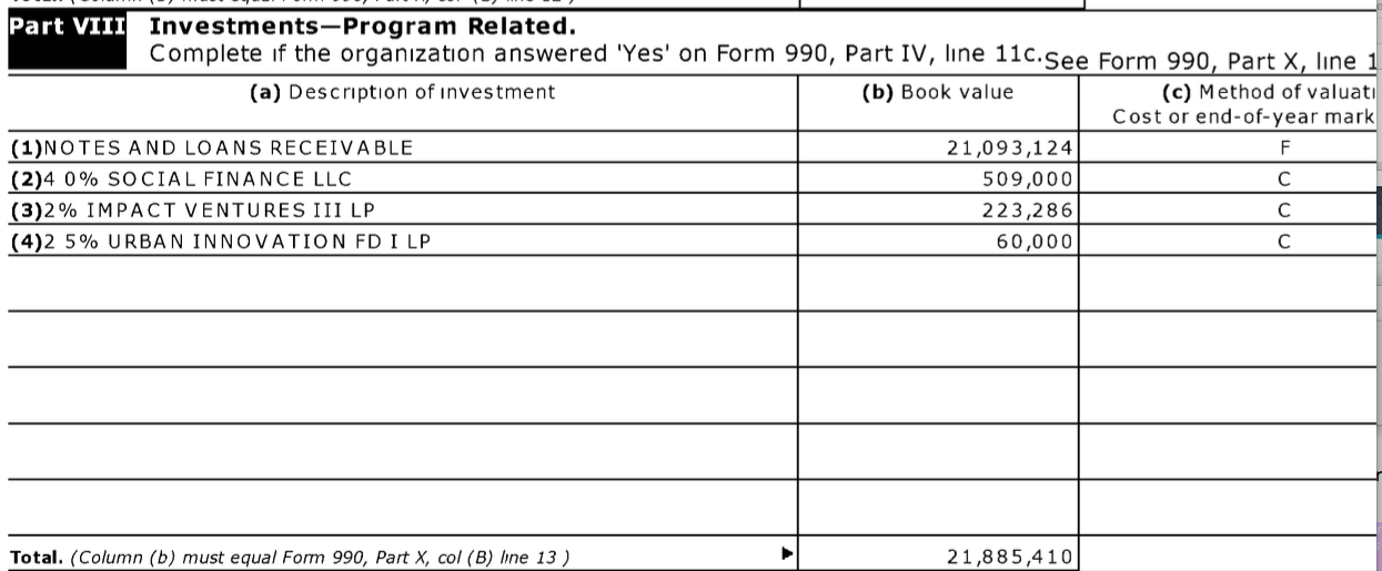 LC EIN#260003950, FY2015 Sched D gives details of $21M Assets (see prior image of “Balance Sheet” Pt. X (top half, Assets) image, Year-End column: Ln.13)
