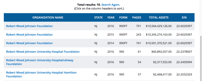 “Searched today, Robert Wood Johnson Foundation (primary) shows over $10 billion assets and other Hospital foundations (by location) named after it: only FYE 2016 shown here. Search again (by EIN# recommended) at: FoundationCenter.org for interactive results (where you can click through to read the returns).