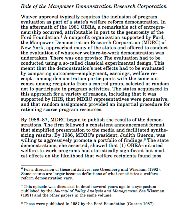 Detail references Ford Foundation’s funding of [MDRC] but on condition that random experimentation with a control group (i.e., Social Science R&D) was employed…