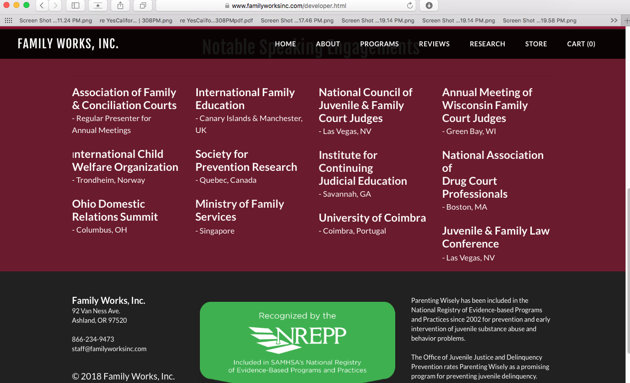 Assembling the Pieces: [1] AFCC 54th Annual Conference (2017)’s Diamond (Top) Sponsor “Avirat” (2001 MN, later -2015- in UK, product “OurFamilyWizard™”) found promoting [2] “Family Works, Inc.” (last found registered in Oregon, running “ParentingWisely™”) which probably profits ℅ royalties from [3] “Center For Divorce Education, Inc.” (Ohio Legal Domiciled Nonprofit at the same Ashland, Oregon, address, under same CEO, running “Children In Between™”) which takes Court-Ordered Parent Education Business (Out-of-State + Spanish-Speaking Parents) from [4] Cuyahoga County Ohio’s Domestic Relations Court’s “Special Circumstances, Rule 34” (1994ff). » Screen Shot 2018-12-16 at 4.38.45 PM