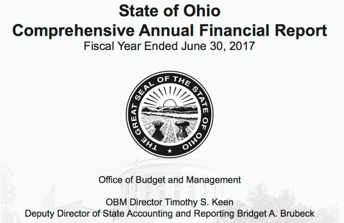 State of Ohio’s CAFR cover. CAFR covers should look (wording) something like this regardless of the reporting entity. It’s over 200 pp, but has a nice table of contents, transmittal letter, “MD&A” (Management Discussion and Analysis), over 100 pp of “Notes” which SHOULD be read (including notes telling what are the reporting entities), and often and especially helpful (usually up front) diagrams/flow-chart-style of exactly how government is organized. Major source of valuable information EVERY time. Get familiar with the concept! (Note: It has to be reported to an international nonprofit association, “GFOA” — so who, really, is in control?) Screenshot taken 12/23/2018, for post “Assembling the Pieces”no FYE 2018 CAFR for Ohio showing up yet.