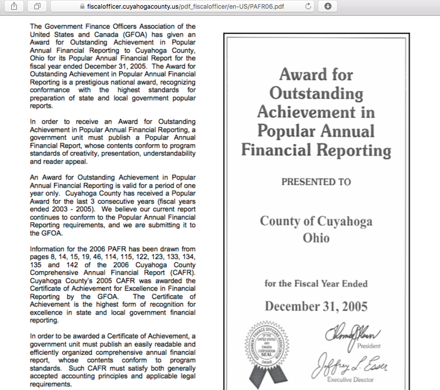 Found at Page URL is: https://fiscalofficer.cuyahogacounty.us/en-US/general-accounting.aspx, pretty far down on the page, we see yet more evidence that Cuyahoga County, Ohio, is aware of the importance of CAFRs and translating them into “PAFRs” (“Popular” Language) – – – while continuing to withhold upfront provision of current OR older CAFRs (i.e., the originals…)
