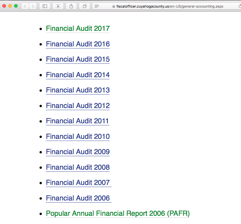Page URL is: https://fiscalofficer.cuyahogacounty.us/en-US/general-accounting.aspx[This county is in Ohio, Great Lakes area, and Cleveland is contained within its geographic/political limits) Hmm…..After leading off with a paragraph about how the county MUST produce and submit an annual CAFR to the GFOA (of USA and Canada), then discussing other types of reports, the same page first, freely posts plenty of “other” (less comprehensive) reports, a condensation as old as 2006 of a 2005 CAFR (see “PARF”) and below that, yet more verbiage on the benefits of producing CAFRS (all on the same page, see nearby image) without actually linking to one!