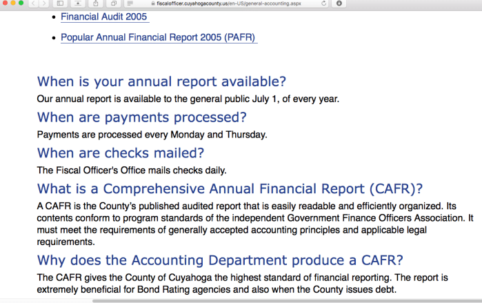 Page URL is: https://fiscalofficer.cuyahogacounty.us/en-US/general-accounting.aspx[This county is in Ohio, Great Lakes area, and Cleveland is contained within its geographic/political limits) Hmm #2 of several….. after trying to distract any readers looking for the county’s CAFRs, it talks about them some more (but provides no links). See my look over at OMB under the “Reports” page where they also (are NOT) provided… Hmm… Screenshot 12/23/2018, //LGH