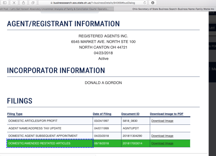 Family Works, Inc. = Ohio Entity 975105 filed in 1997, For-Profit, Still Active, Filings Shown (latest highlit in green)