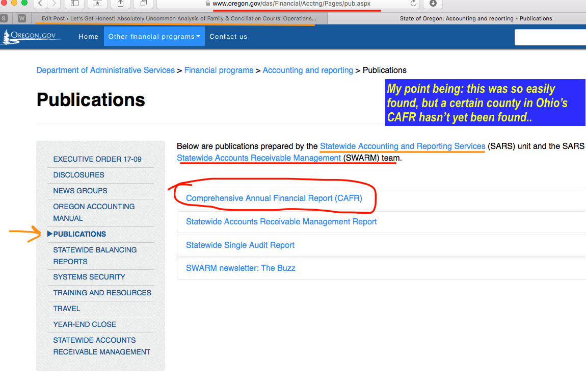 Assembling the Pieces: [1] AFCC 54th Annual Conference (2017)’s Diamond (Top) Sponsor “Avirat” (2001 MN, later -2015- in UK, product “OurFamilyWizard™”) found promoting [2] “Family Works, Inc.” (last found registered in Oregon, running “ParentingWisely™”) which probably profits ℅ royalties from [3] “Center For Divorce Education, Inc.” (Ohio Legal Domiciled Nonprofit at the same Ashland, Oregon, address, under same CEO, running “Children In Between™”) which takes Court-Ordered Parent Education Business (Out-of-State + Spanish-Speaking Parents) from [4] Cuyahoga County Ohio’s Domestic Relations Court’s “Special Circumstances, Rule 34” (1994ff). » State of OREGON’s CAFR FYE2017 EASILY found (coverpp + some excerpts form its Transmittal Ltr!! (UNlike still MIA Cuyahoga CountyOH’s CAFRs– ANY year |~~7 Sshots 2018Dec23Sun @1.30.14 P