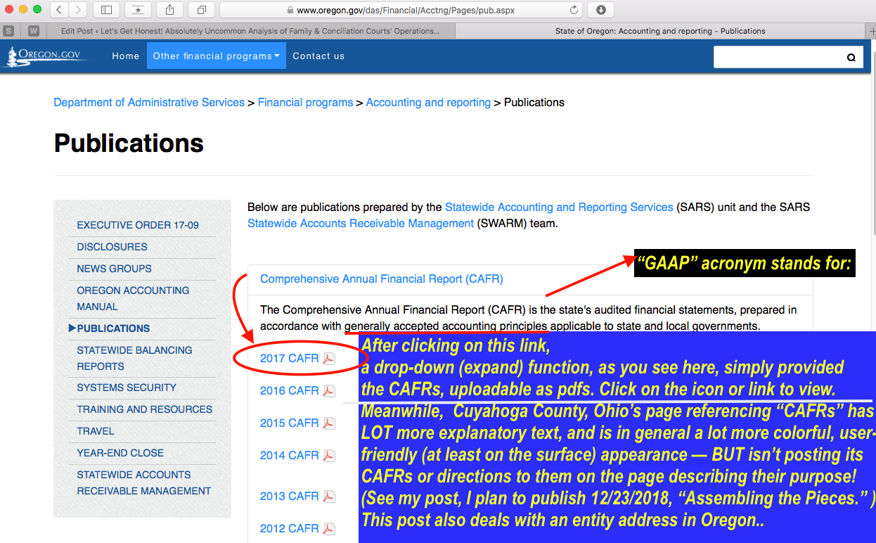 Assembling the Pieces: [1] AFCC 54th Annual Conference (2017)’s Diamond (Top) Sponsor “Avirat” (2001 MN, later -2015- in UK, product “OurFamilyWizard™”) found promoting [2] “Family Works, Inc.” (last found registered in Oregon, running “ParentingWisely™”) which probably profits ℅ royalties from [3] “Center For Divorce Education, Inc.” (Ohio Legal Domiciled Nonprofit at the same Ashland, Oregon, address, under same CEO, running “Children In Between™”) which takes Court-Ordered Parent Education Business (Out-of-State + Spanish-Speaking Parents) from [4] Cuyahoga County Ohio’s Domestic Relations Court’s “Special Circumstances, Rule 34” (1994ff). » State of OREGON’s CAFR FYE2017 EASILY found (coverpp + some excerpts form its Transmittal Ltr!! (UNlike still MIA Cuyahoga CountyOH’s CAFRs– ANY year |~~7 Sshots 2018Dec23Sun @1.30.36 P
