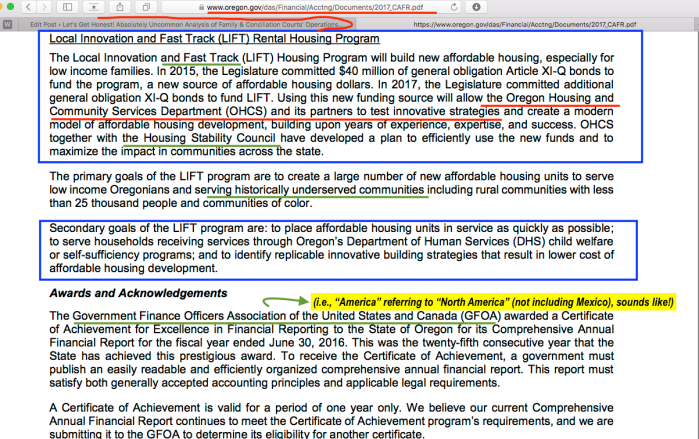 Assembling the Pieces: [1] AFCC 54th Annual Conference (2017)’s Diamond (Top) Sponsor “Avirat” (2001 MN, later -2015- in UK, product “OurFamilyWizard™”) found promoting [2] “Family Works, Inc.” (last found registered in Oregon, running “ParentingWisely™”) which probably profits ℅ royalties from [3] “Center For Divorce Education, Inc.” (Ohio Legal Domiciled Nonprofit at the same Ashland, Oregon, address, under same CEO, running “Children In Between™”) which takes Court-Ordered Parent Education Business (Out-of-State + Spanish-Speaking Parents) from [4] Cuyahoga County Ohio’s Domestic Relations Court’s “Special Circumstances, Rule 34” (1994ff). » State of OREGON’s CAFR FYE2017 EASILY found (coverpp + some excerpts form its Transmittal Ltr!! (UNlike still MIA Cuyahoga CountyOH’s CAFRs– ANY year |~~7 Sshots 2018Dec23Sun @1.39.14 P