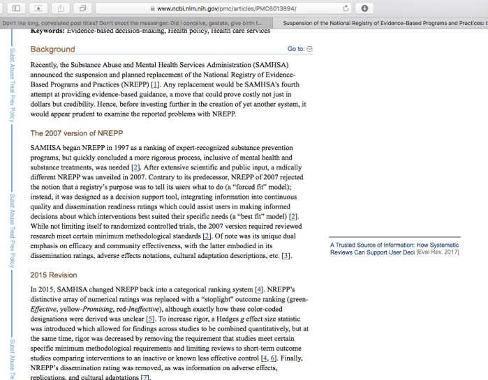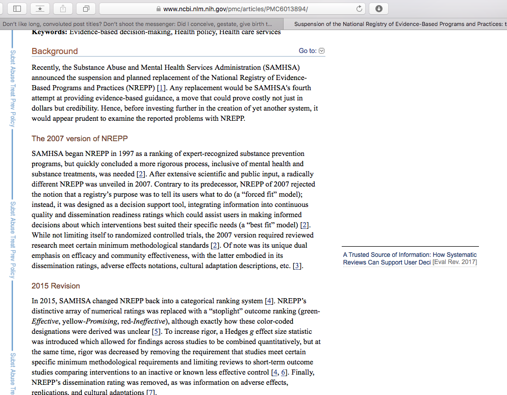 Don’t like long, convoluted post titles? Don’t shoot the messenger: Did I conceive, gestate, give birth to, nurture and L.A.U.N.C.H. these “Great Ideas” ? (Started mid-Dec., 2018; Publ. “WYSIWYGG” March 15, 2019). » nrepp from gov’t (nih,nlm,pmc) source – article on suspension of nrepp (sghennessy) informative re the setup, pmc® archives, revw processes ~~screen shot 2019-