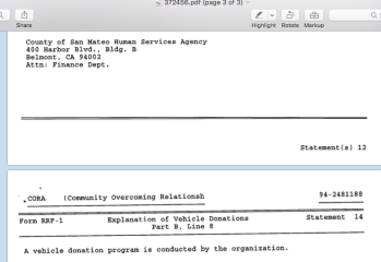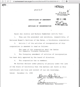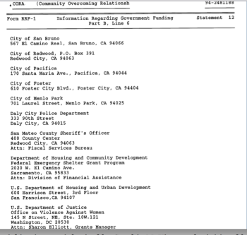 (1) (Shown on earliest available pdf image) “La Casa de San Mateo” (changed in 1992 to): (2) “Battered Women’s Services of San Mateo” (changed in 1995 to:) (3) “Center for Domestic Violence Prevention,” (changed in 2004 only to) (4) “CORA (Community Overcoming Relationship Abuse).” At all times, “The Corporation has no members.” (Last two images of gallery below show which gov’t agencies supporting it, as submitted through a recent “RRF” (charity annual renewal form for the state). They are supposed to provide a personal contact name and telephone # for all government agencies; did for some, but not all. That is the clear instruction on the form.