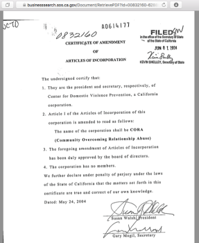 - CORA (Communities Overcoming Relationship Abuse) CA Entity C0832160, EIN# 942481188, various namechanges since 1992 (entity began 1977) gradually eliminate references to women, battering, or even “domestic violence” (image gallery created 4-12-2019 for migrated page from FamilyCourtFranchiseSystem, “Three Cities that Rule the World,” incl. ever-expanding DV Leadership”