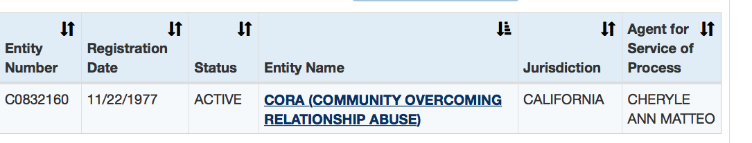 CORA (Communities Overcoming Relationship Abuse) CA Entity C0832160, EIN# 942481188, various namechanges since 1992 (entity began 1977) gradually eliminate references to women, battering, or even “domestic violence” (image gallery created 4-12-2019 for migrated page from FamilyCourtFranchiseSystem, “Three Cities that Rule the World,” incl. ever-expanding DV Leadership”