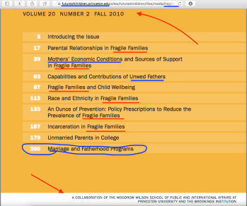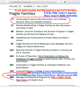 For a big, fat and gaining interstate as well as international traction university/foundation-backed example: The Princeton University-Cambridge University-Klaus J. Jacobs Foundation (and other US-based 501©s, such as the Foundation for Child Development and Brookings Institution), so-called (by the web page title) Partners” of “The Future of Children” (“FofC” for short) (<==Scroll down including all the way to the bottom) ……The FofC is a sponsored publication itself a Princeton-Brookings project headed up by former US HHS Welfare Reform/Fatherhood-Marriage-Promoting activist psychologist from North Carolina, Ron Haskins, who is also co-director with Isabel Sawhill (formerly at the Urban Institute, another 501©3) of a Child and Family center at Brookings Institution’s  along with (as to TheFofC) Princeton’s Sara McLanahan (who’s married to a professor at Columbia University, close collaboration/involvement in general of father-focused center run by Ronald D. Mincy with prior close ties to Ford Foundation (the Fragile Families concept), Annie E. Casey Foundation, and etc.).