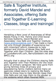 [fn#] I chose that “Livfully” odd link because it mentions that this name was formerly “David Mandel & Associates” and represents a suite of “e-tools.”  Click (from there) on “EndingViolence.com” to see “Safe & together Institute” banner for more.  I’ve posted on this a number of times, and Tweeted also). The link I provided also shows, it seems, that LundyBancroft and BarryGoldstein approve.  Naturally — it’s continuing to promote batterers intervention programming and says nothing about the US DHHS responsible fatherhood/healthy marriage programming and doesn’t inform customers (US or overseas) of the existence ALSO of access and visitation funding grants in this country since at least 1988 (law, 1984), and now engrained into the Social Security Act (1996ff) with $10M a year funding for this type of programming, and related…