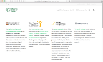 RIGHT IMAGE, Left to Right:  University of Cambridge (UK), The Future of Children (USA), Jacobs Foundation (Switzerland), and “Family Initiative” (UK). Under (fine print, from top of the page, under “About Us/Our Partners”) https://www.childandfamilyblog.com/about-us/our-partners/  That image is basically the whole page content.