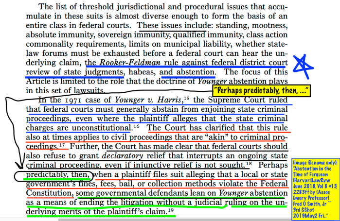 “Abstention in the Time of Ferguson” (Harvard Law Review, June 2018, Vol. 8, No. 131, 2283ff, by Fred O. Smith, Jr. (Assoc Prof, Emory University) (obstacles to federal lawsuits about systemic state injustice incl. , Rooker-Feldman rule, sovereign & qualified immunity, and Younger abstention as “perhaps predictable gov’t’ defendants'” response to seeking federal involvemt…//LGH 2019May2