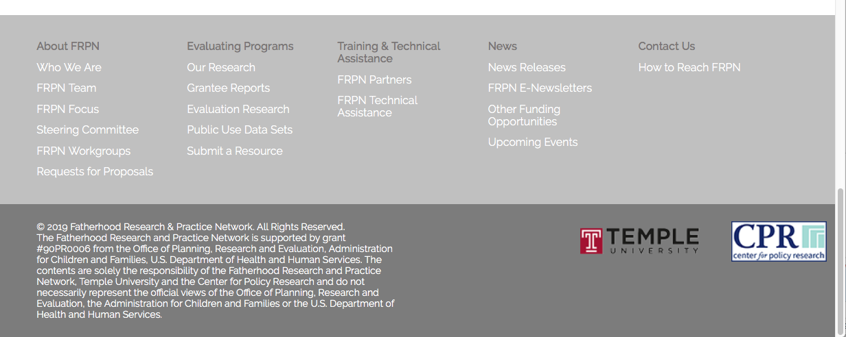 FRPN.org Website footer; read the fine print which acknowledges federal funding. Notice two logos: Temple University and 1980ff Colorado nonprofit “CPR” (close connection to AFCC origins through Jessica Pearson). I did locate the HHS grants — they went to the larger TEMPLE, not the smaller CPR, making the “dots” much harder to connect. Searchable at TAGGS.hhs.Gov (Recommend use Advanced Search function).//LGH May 7, 2019 for post. Judging by nearby images I was also publicizing this in 2016
