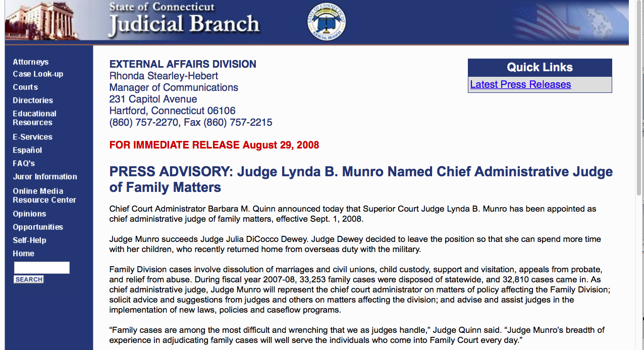 State of Connecticut Judiciary August 29, 2008 Press Advisory that Judge Lynda B. Munro is named “Chief Administrative Judge of Family Matters,”(Screenshot taken May 12, 2019)
