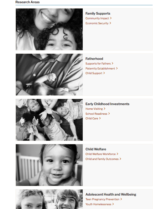 https://childandfamilyresearch.utexas.edu (Image 3 of 3, “News” taken 4/17/2019 from home page. Notice the category names. Part of a mother’s smiling face shows (title: “Family Supports”), but not one word representing women, mothers, or mother-child relationship. Second to top image, what looks like a man’s chest and arms holding a child (but no face shown) next to a single-word label “fatherhood” with sub-links also indicating male gender. Other heading titles: Early Childhood…Child Welfare .. Adolescents. I guess when it comes to “Families,” mothers do not exist, or deserve even a passing mention…