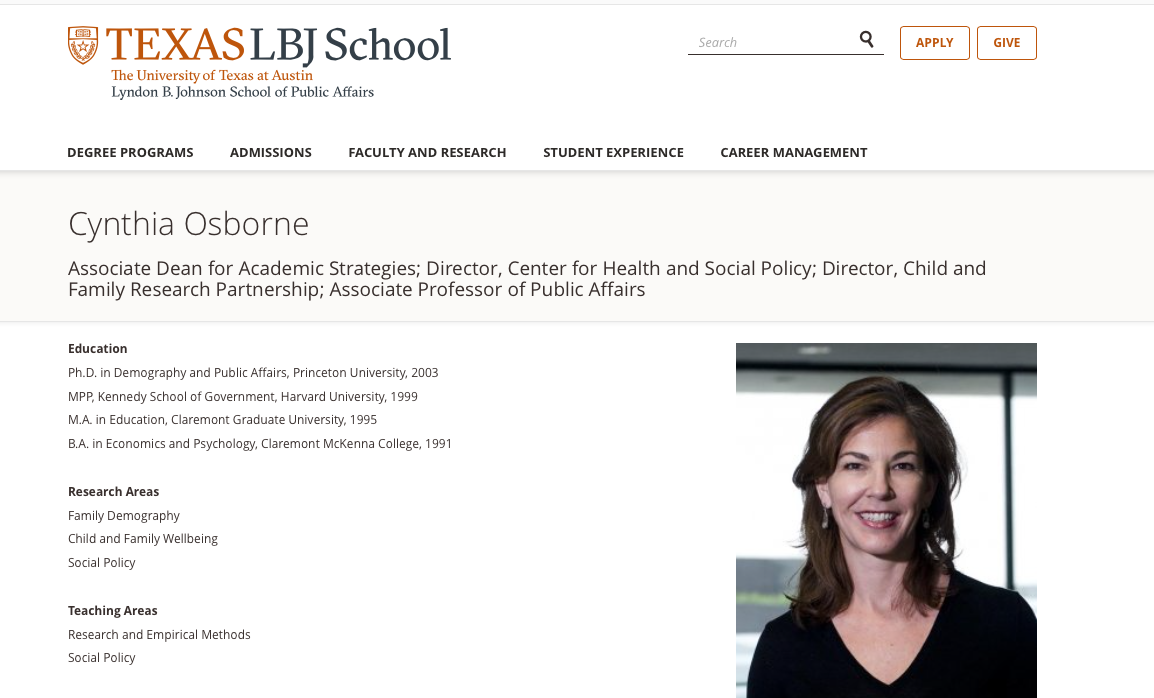 Cynthia Osborne faculty page at LBJ School of Public Affairs, UTexas-Austin (Image #1 of 2, not incl. from the nearby available CV provided as pdf link on the faculty page