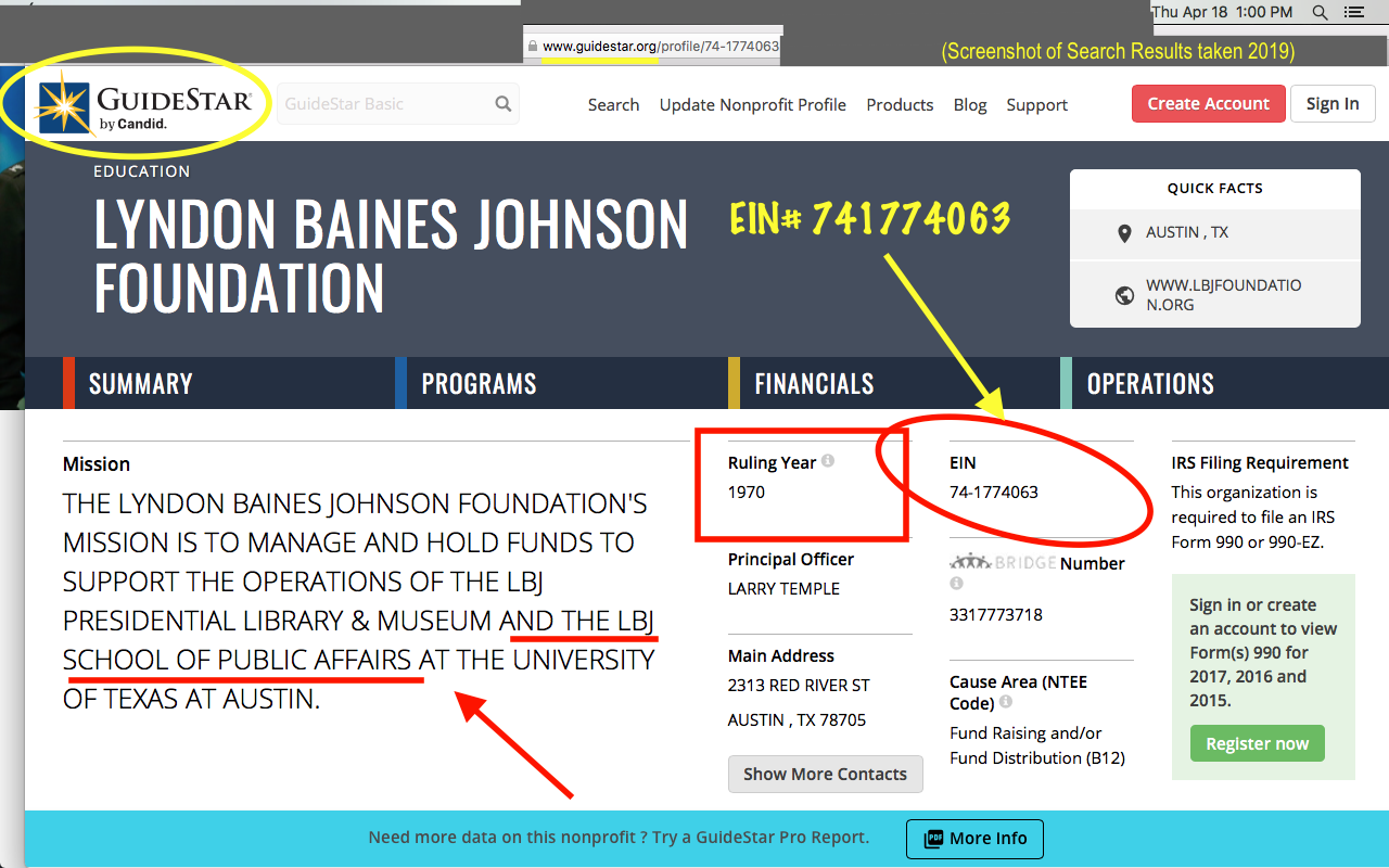 LBJ Foundation described (and EIN# given) by Guidestar (now owned by “Candid”). Click image to enlarge.