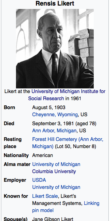 Wiki for Rensis Likert, Listed by University of Michigan’s ISR as its (1948) founder. Viewed May 14, 2019.