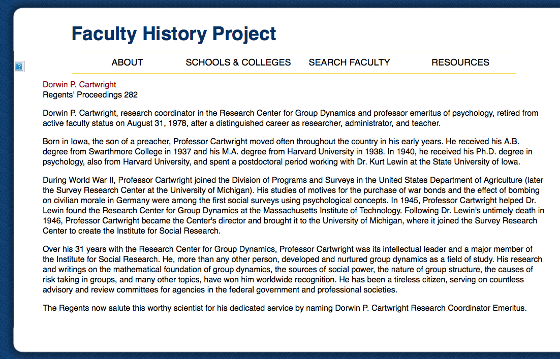 Dorwin Cartwright (from “Faculty History Project” at UMichigan. He worked many years at the UMichigan’s ISR. See “helped Kurt Lewin found the Research Center for Group Dynamics at MIT in 1945”