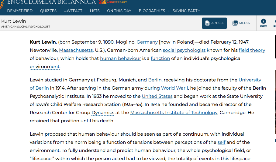 Encylopedia Britannica on Kurt Lewin background and philosophy. Note: Berlin Psychoanalytical Institute, “the State University of Iowa’s Child Welfare Research Station (1935–45), then MIT Center for Group Dynamics.”(viewed 5/14/2019).