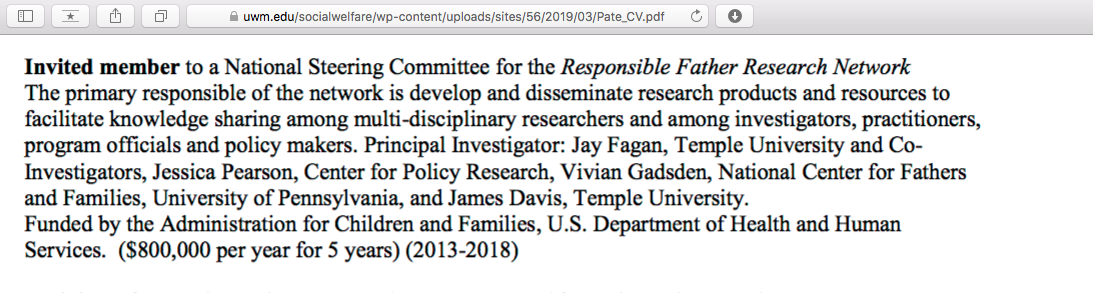 David Pate (UWisc IRP, CFFPP) CV details showing involvemt w HHS-funded ($4M over 5 yrs @ Temple U in PA) the FRPN.org | Note Jessica Pearson (AFCC original founder|key player), Jay Fagan, and the NCOFF etc