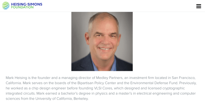 Mark Heising of the Heising-Simons Foundation. He is the son-in law (wife is Elizabeth Simons) of hedge fund billionaire mathematician (MIT/UCBerkeley) James H. Simons. This is their (this generation’s) family foundation it says.