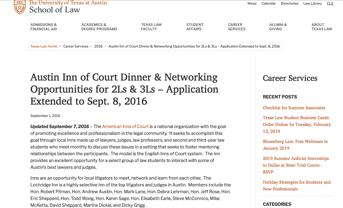UTexas Austin School of Law (Sept. 1, 2016) seeking applicants from 2L and 3L students to apply to the Lochridge Inn of Court for its selective opportunities (Note: names which judges one can hang with)…
