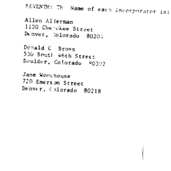 - NACC’s Colorado SOS Filings (original articles: 3 incorporators 1978 – faded, but: Allen Alderman (Denver), Donald C. Bross?, Boulder, Jane Wodehouse, 720 Emerson St, Denver) viewed 2019-05-25