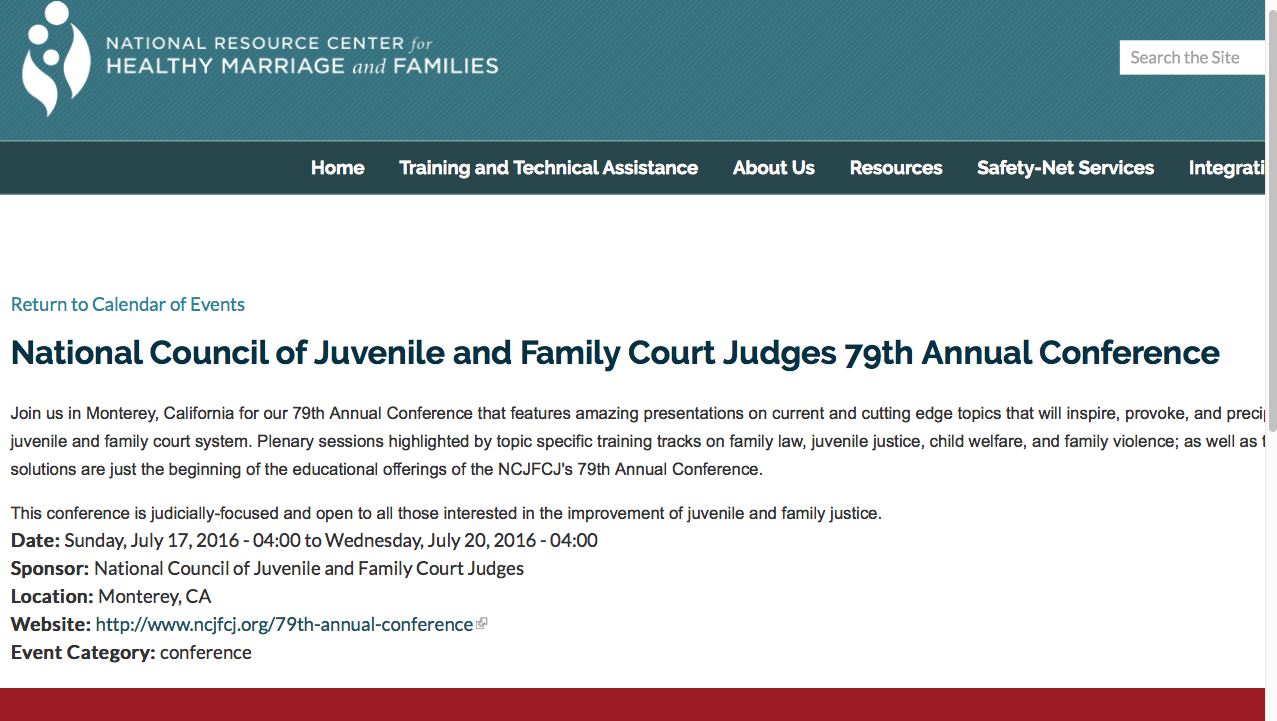 A National Resource Center (supported by HHS-administered grant 90FH0003, administered by multi-national global for-profit “ICF” on strategies to (better) promote health marriage and families, the alleged “79th Annual Conference” of NCJFCJ (2016) in Monterey, CA, is advertised.