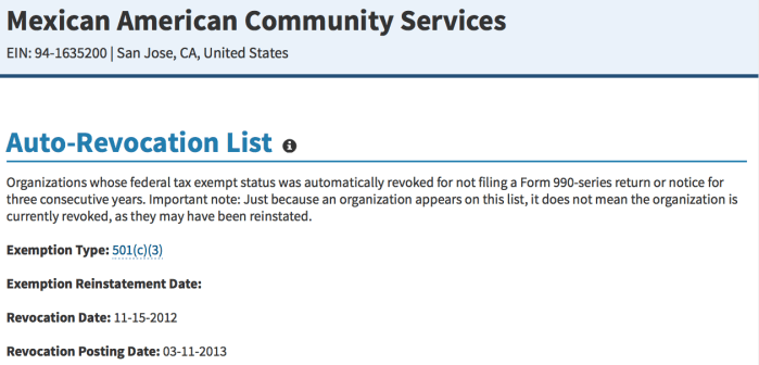 MACSA (written out) in San Jose: The IRS tax-exempt organization search shows when it became “status revoked” (2012)