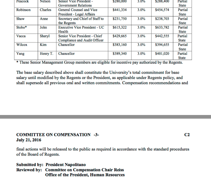 Janet Napolitano as UCalif (The whole system) President requesting Salary Raises for her Senior Mgmt Group (incl Nelson Peacock, then paid $280K (base) — see chart) in July 2016