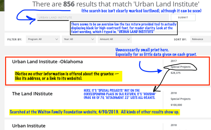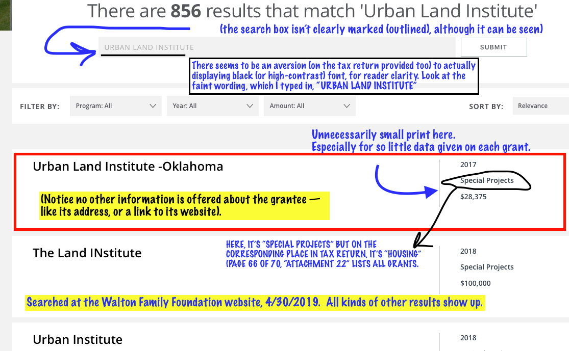 WaltonFamilyFoundation.org grants database search (annotated) showing small 2017 grant to ULI-Oklahoma.