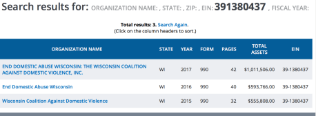 End Abuse in Wisconsin (WCADV) EIN# 391380437 Search produces the missing year FYE2016. Notice three different versions of entity name displayed by FoundationCenter.org (the database searched here).