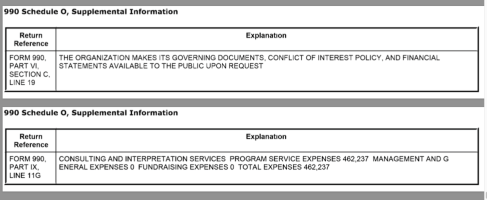 FY2017 (when the contributions almost doubled, after mentioning (on page 1) “sub-grantee award programs” shows no awards whatsoever — simply double the amount on (Expenses) Part IX Line 11g “other”. Prior year: $462K of $2.5M (approx). 2017: $901K of $4.1M (approx). In other words, the percentage of unidentifiable “fees for services” while Part VIIA (BOTH years) “Independent contractors paid over $100K) went from about 1/5th of the total to between 1/4th and 1/5th of a larger total. Here’s what the “explanation” of “over 10% of “Other Expenses — Non-Employees” looks like Year 1, Year 2, as expressed on Schedule O (alongside “financials and governing documents available “on request”).