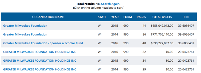 Greater Milwaukee Foundation (EIN# 396036407), FYrs ending 2014-2016, top 3 rows, though not in year order) show assets over ½ billion, not too unusual for a community foundation.