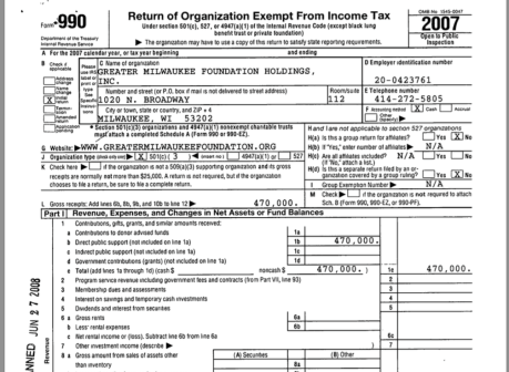 Greater Milwaukee Foundation HOLDINGS, Inc. was formed (says a FY2008 return, where the revised IRS form has a header asking “when formed?”) but this is marked (top left) ‘Initial Return” in 2007. You can see the $470K noncash donation. Other parts of the return show this as real estate; then FY2008 sold at a loss and proceeds given to the foundation, with some operating expenses (creating a deficit) and so on…
