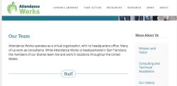 Attendance Works operates as a virtual organization, with no headquarters office. Many of us work as consultants. While Attendance Works is headquartered in San Francisco, the members of our diverse team live and work in locations throughout the United States. (“Our Team” page) [One image above also shows that page]
