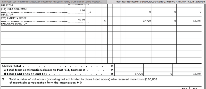 EndAbuseWI.org FY2016 Form 990 (FY=calendar year) tax return Part VIIA (shows only one paid officer — Patricia Seger. “ANOMALIES” — The CFO/Administrator paid (the next year under increased federal grants) $73K actually signed the FY2016 return (electronic signature, and DATE (when signed) is blocked out, not knowable from this version). The CFO isn’t even listed as an administrator on FY2016, although on her watch, apparently, the organization overspent by over $52K (of $2.5M rec’d).