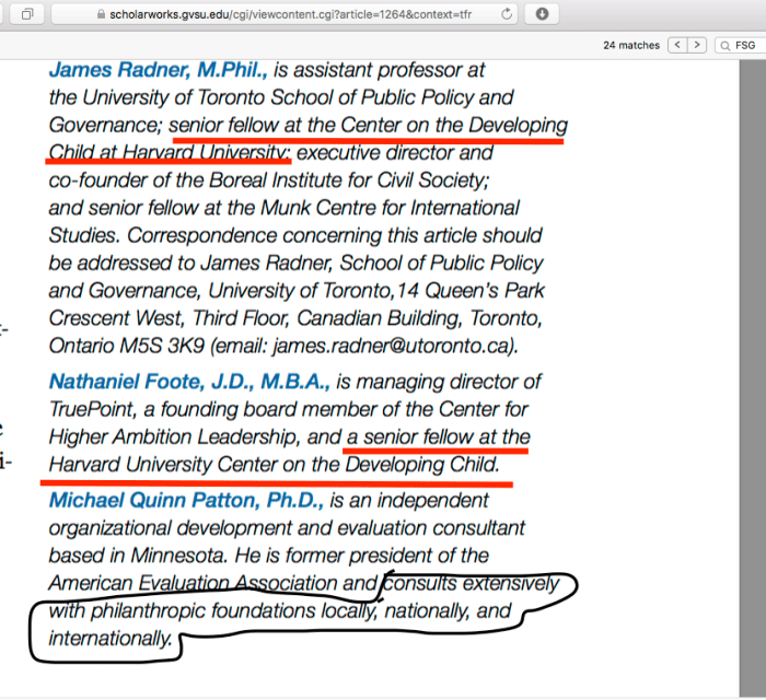 Radner, Foote and Patton, with the first two working as Senior Fellows at Harvard’s Center for the Developing Child (fairly recent), which Palix Foundation admits to funding. Foote also associated with FrameWorks Institute, Inc. a related nonprofit.. {url shown at top of image}