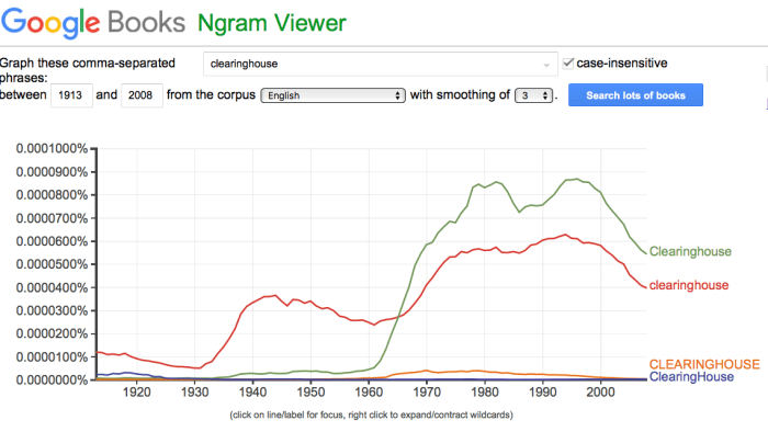 Mix ‘n Match Misleading Terms: QIC, Coordinating Councils, Collaboratives and Commissions | Which Organizations Use Them | Which Parts of Government Control and/or Fund Them…(June 16, 2019) » Uses of the word ‘Clearinghouse’ (Google N-Gram searches Google Bks) ~ 2 SShots 2019June10 Mon PST @11.08.33 AM