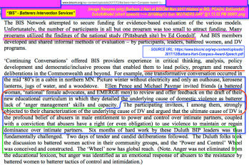 - Or see Barbara Hart’s November 1, 2017 speech at the “Miles to Go” BISC-MI conference which reveals even more than I’d already picked up about her (and colleagues, incl. other lawyers listed here active in the national “DV advocacy” issues) early-on decisions to incorporate diversionary, behavioral modification programs such as “Batterers Intervention” (and supervised visitation, coordinated community response, etc.) solutions… It’s a short-read, under 2,000 words.