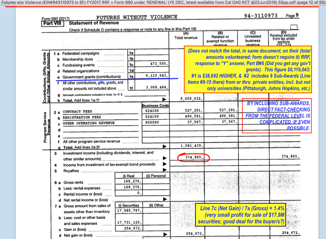 Futures w|o Violence (EIN#943110973 in SF) FY2017 RRF + Form 990 under ‘RENEWAL’ (YE DEC, latest available from Cal OAG RCT @23Jun2019) In same doc’t ‘Govt Grants total (Ln1e, $6.1M) DN match RRF total, uploaded in same doc’t. See comments.