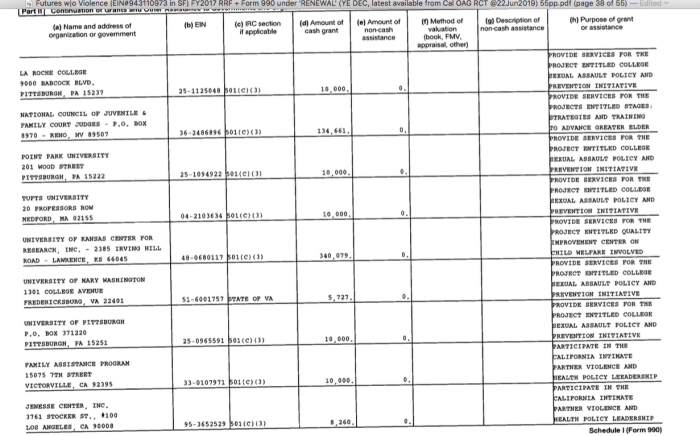 Futures w|o Violence (EIN#943110973 in SF) FY2017 RRF + Form 990 under ‘RENEWAL’ (YE DEC, latest available from Cal OAG RCT @23Jun2019); IRS Form 990 Sched I (Grants FROM not TO Futures as recorded on the RRF), same year, incl $134K back to NCJFCJ (RRF explanation page unusually, shows sub-awards/Clean Copy (original was shown at 90′ angle, 11X8|I flipped it to read=smaller print)