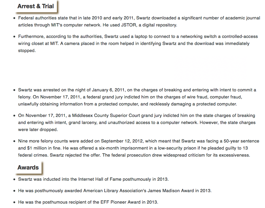 In About 2,500 Words,** Why I Still Bother… [Published June 29, 2019/#1 of 2] » Aaron Swartz Arrest, Trial, Awards (partical page) Screen Shot 2019-06-27 at 5.11.18 PM