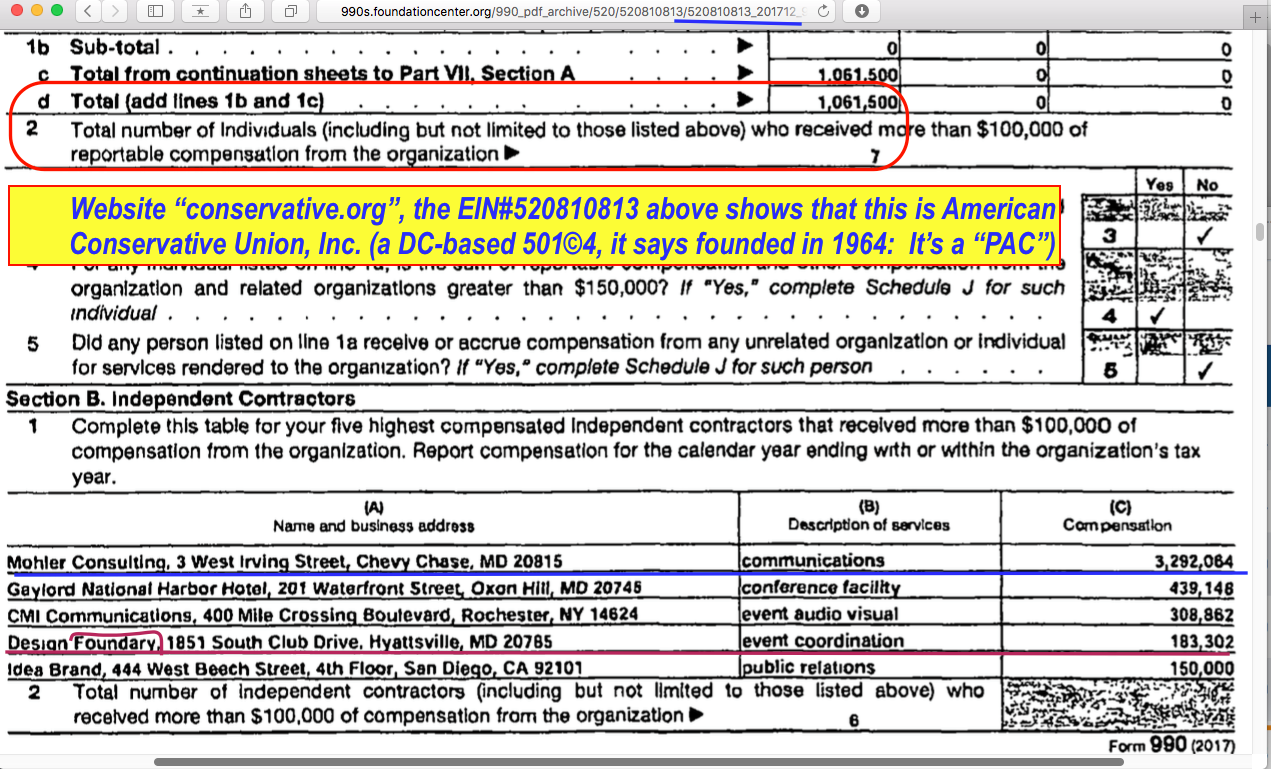 Three Footnotes to About 2,500 Words on Why I Still Bother (to Blog). (#2 of 2,June 29, 2019) » American Conservative Union (501©4) FY2017 (YE Dec) Pt VIIB top 5 Subcontractors (Mohler, $3’2M) (showing also total PtVIIA is $1M) Screen Shot 2019Jun29 @ 5.15.39 PM