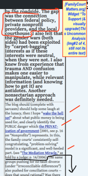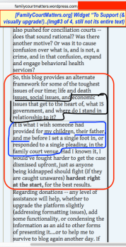 The average post is 5,000-10,000+ words (including quotations), results from ongoing, original connect-the-dots investigations and analysis, while referring readers to others who’ve done their own research under hard conditions, including court-created poverty, trauma, and even sometimes jail (see Richard Fine). Basically, I saw a gap in informed coverage for not just women, but specifically mothers, and stepped in to fill and blog it and point to others’ analysis who’d been inappropriately dropped by the roadside. The gap was the connection between federal policy, private nonprofit providers, and the local courthouse. I also felt that the gender wars (both sides) had been exploited by “carpet-bagging” interests as if these interests were neutral, when they were not. I also knew from experience that trauma AND confusion makes one easier to manipulate, while relevant information (and knowing how to get it) are antidotes. Another nonsectarian approach was definitely needed. The blog should (complete with sarcasm) should help some laugh at the lunacy, then I hope “wake the hell up!” about what public money is being used for, and clearly identify the PUBLIC danger which the PRIVAT-ization of government [2001, see p. 16 on “Nonprofits”) represents. In this, the family courts’ consistently self-congratulating, “problem-solving” model is a significant, and well-heeled part. (see “The Mediation Miracle,” as told by a judge; p. 16/2006). The same groups pushing for no-fault divorce (under “irreconciliable differences”) also pushed for conciliation courts — does that sound rational? Was there another motive? Or was it to cause confusion over what is, and is not, a crime, and in that confusion, expand and engage behavioral health services? So, this blog provides an alternate framework for some of the toughest issues of our time; life and death issues, social issues, and economic issues that get to the heart of, what IS government, and where do I stand in relationship to it? It is what I wish someone had provided for my children, their father, and me before I set a single foot in, or responded to a single pleading, in the family court venue. Had I known it, I would’ve fought harder to get the case dismissed upfront, just as anyone being kidnapped should fight (if they are caught unawares) hardest right at the start, for the best results. Regarding donations — any level of assistance will help, whether to upgrade the platform slightly (addressing formatting issues), add some functionality, or condensing the information as an aid to other forms of presenting it….or to help me to survive to blog again another day. If it’s not yet understood HOW the family court system effectively (and I believe intentionally) functions to keep at least one out of every two parents in marginalized “economic survival mode” year after year, than it’s simply not understood, and should be, as these people live in MOST communities today. I wrote on behalf of and knowing from experience that the people who needed this information the most could afford it the least; they were in survival mode year after year and often facing the challenge of their lifetimes (retaining contact, or re-gaining contact with their own children). As was I. Learning this material changed and empowered me, not in the case (it came too late for that), but as a human being. Some feedback has included (women, in particular) saying it prevented them from going crazy. Basic Truth has a way of doing that. I feel responsible to get the information into a form to document of a system in rapid change…a slice of history from a “user” perspective on these systems … and which won’t be buried (as social media and the internet changes) as the original material from the 1990s was. This groundwork has been done, and I can’t continue the work for free. Your donations will help consolidate results into better visual format and they will also help me, the blogger to finalize this project, and still survive personally. Moreover, if they do NOT come in, then I will have a free assessment of its current perceived worth (other than what individuals have said, including THANK YOU!), at this time. Teaching/PR Goals for Parents and Public Include: [Warning: This part will offend some people, but it’s a Public Interest part]